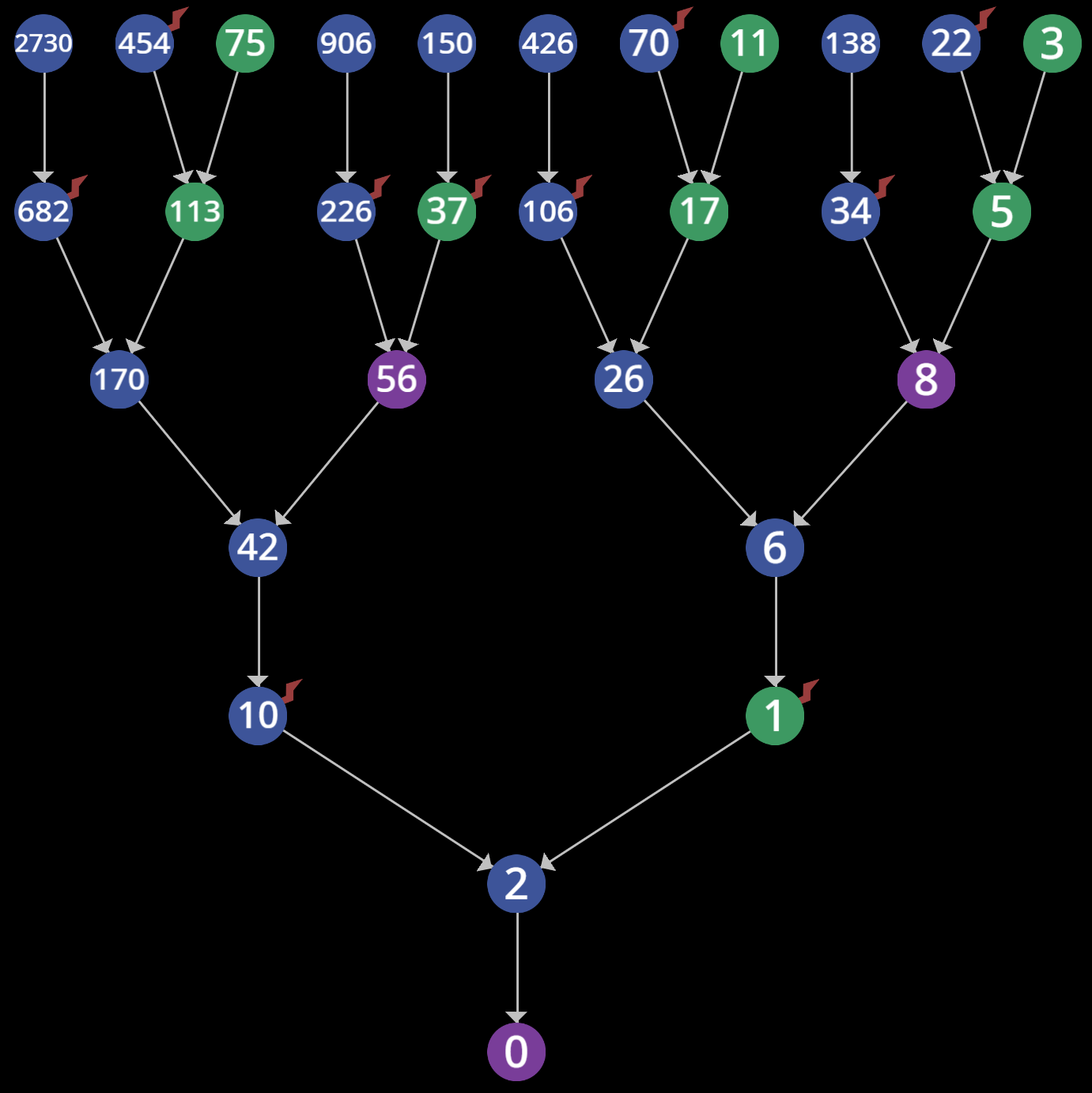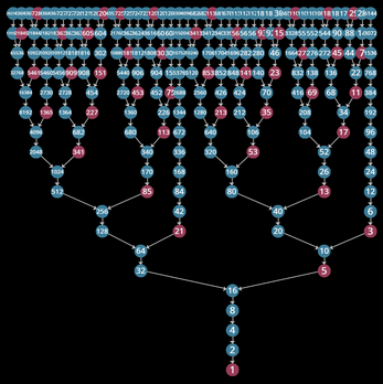 There's also a second mode which focuses on numbers of the form 6n+4 (The ones two numbers lead to), which are represented with their n values. Some of them have a red spike (to represent chains of multiples of 3) instead of a second backward connection.