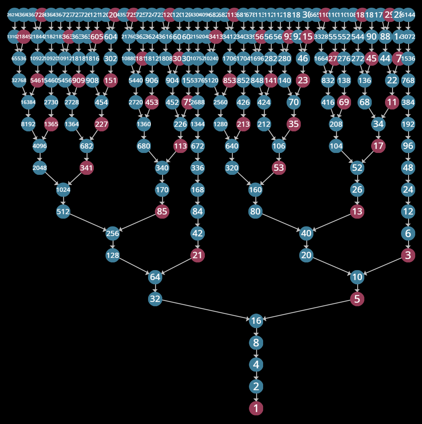 This tool lets you explore a tree network connecting numbers together if one leads to the other. You can also enter whatever number you want and view where it is on the tree. I also tried allowing negative numbers, but it can be buggy when viewing the loops they go into.