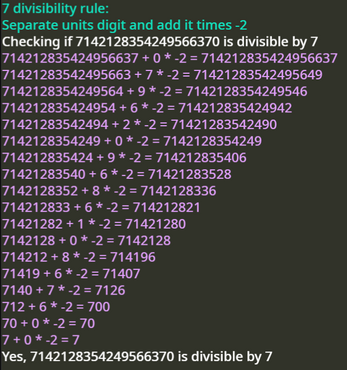 Example: 2716 divisibility by 7. A simple way to get rid of the 6 units is by subtracting 21 * 6, because 21 is a multiple of 7 that ends in 1.